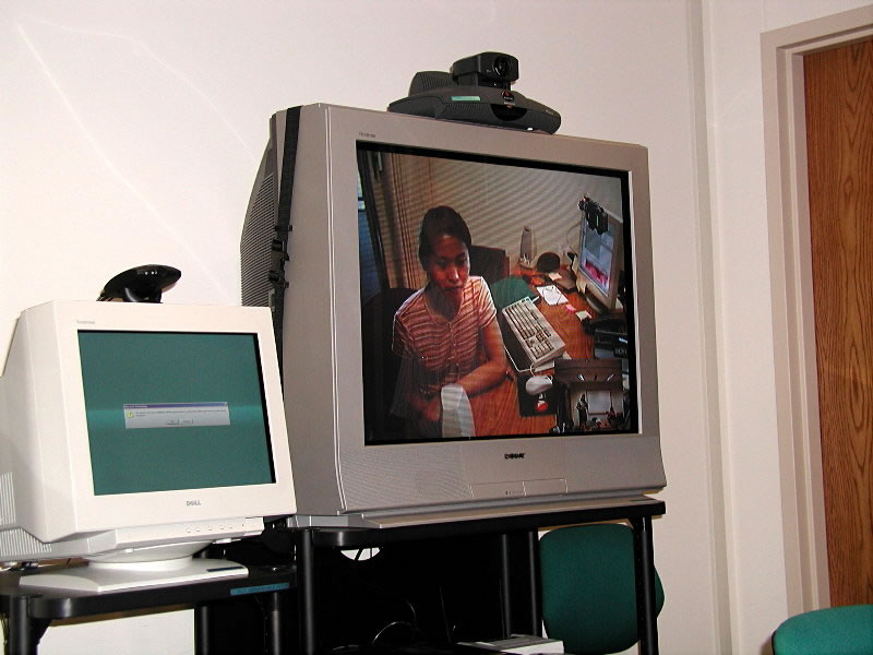 | Viewing excel and a videoconference session. | Viewing someone else in another room with video conference equipment. |